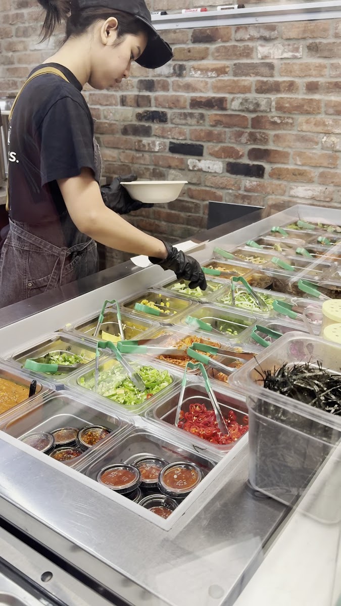 Food was out of the ordinary with flavor, robust, and authenticity! The create your own bowl was unique and filling. The portions are large and can last for more than 1 meal. We got the pork belly and chicken, both very good! The major turn off was that the waiter used gloves to set aside the portions in the bowl (which was great!) although proceeded to wipe the sweat off of his face, then tie his shoe, and then go RIGHT BACK to preparing my meal, GROSS!