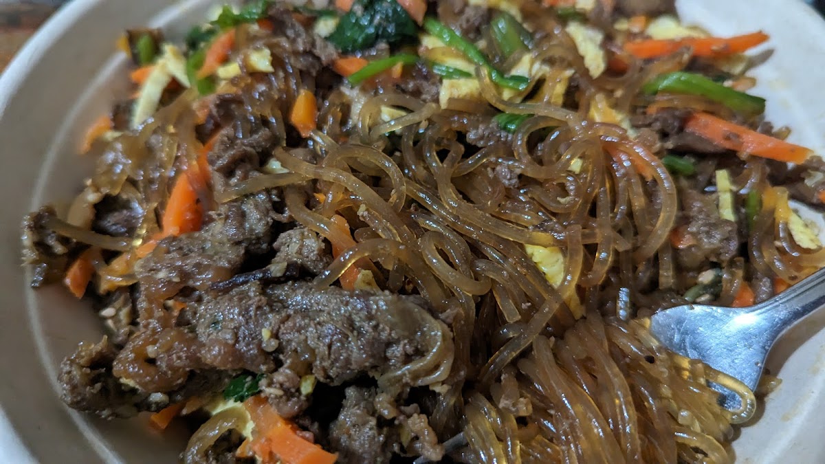 Tasty and generous portions. I ordered their traditional jap chae and Korean fried chicken for lunch, and they were both delicious. There were generous amounts of veggies and bulgogi along with the bouncy glass noodles mixed with savory, garlicky sauce with a hint of sesame oil. The bone-in fried chicken pieces were humongous compared to other chicken wing places; and they were smothered in plenty of honey butter, I couldn't stop licking my fingers. Definitely will visit again to try their other dishes!!! The restaurant and kitchen looked spacious and clean - You can see the chef and workers preparing the food. Very nice customer service and decor, and the prices already include taxes so there's no "extra" charge on top of the menu price.
